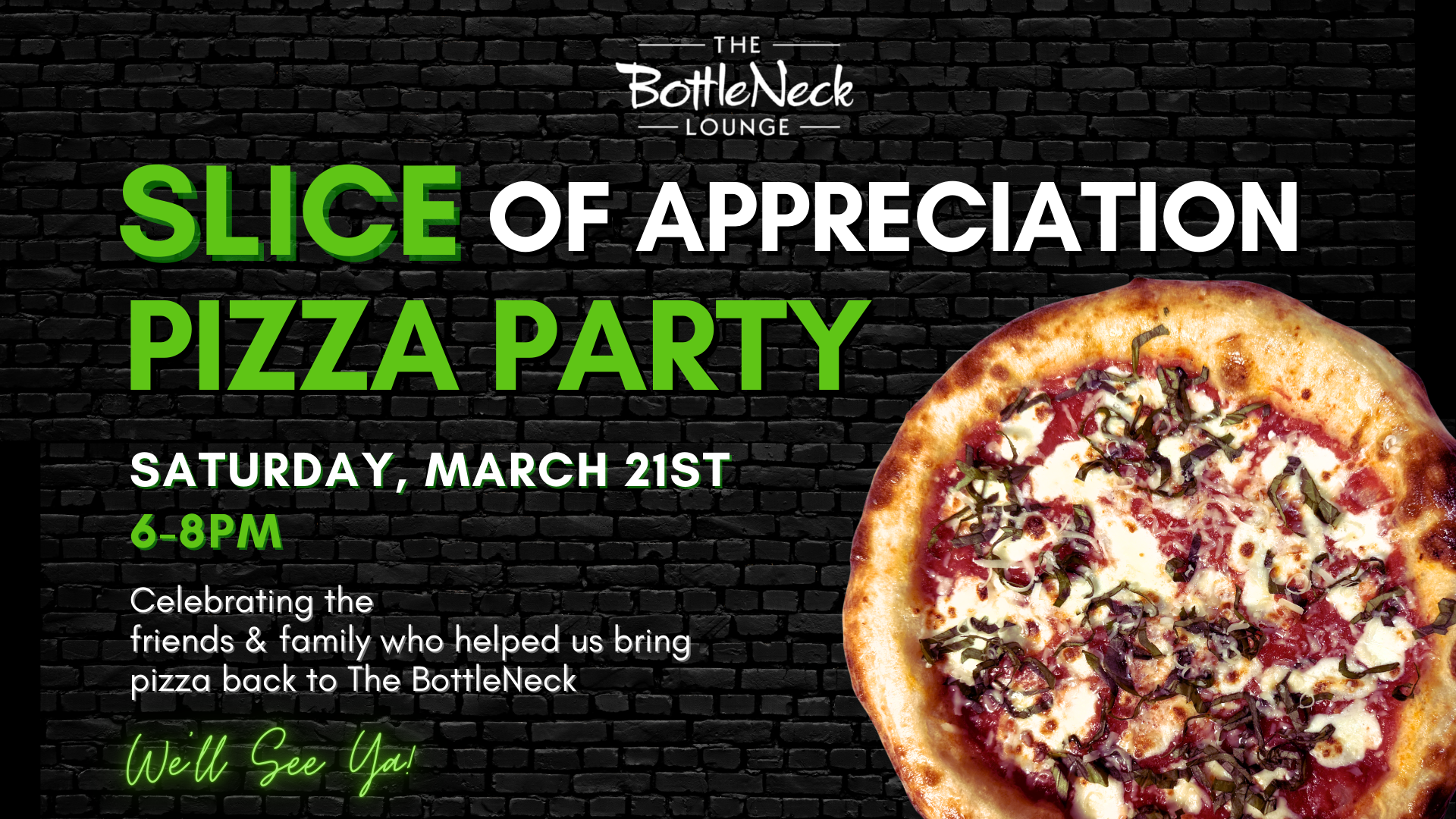 We’ve been serving delicious pizza since our oven was delivered, and we're celebrating our first year and you with a "Slice of Appreciation" Pizza Party! Please join us on Saturday, March 21st, from 6-8 PM.